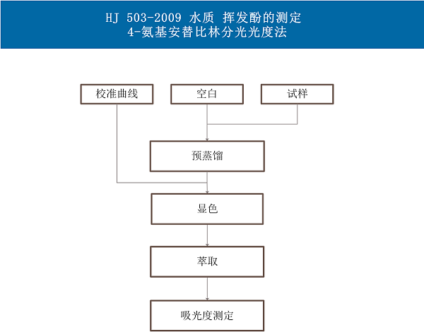 HJ 503-2009 《水質(zhì) 揮發(fā)酚的測定 4-氨基安替比林分光光度法》是水質(zhì)揮發(fā)酚檢測的常用標準之一,其第一法為萃取分光光度法,通過蒸餾使揮發(fā)性酚類化合物與干擾物質(zhì)和固定劑分離,蒸餾出的酚類化合物于pH(10.0±0.2)介質(zhì)中,在K3[Fe(CN)6]存在下,與4-氨基安替比林反應(yīng)生成橙紅色的安替比林染料,用CHCl3萃取,在460nm波長下測定吸光度。前處理過程可用到全自動智能一體化蒸餾儀和全自動液液萃取儀,實驗流程如下所示: